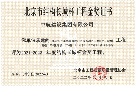 近日,经北京市优质工程评审委员会专家组评检、推荐、审议,由集团公司承建的菜园街及枣林南里棚户区改造项目18#住宅楼、19#住宅楼、20#住宅楼、S7#楼、E-1#门卫、E-2#门卫及地下车库工程(以下简称菜园街及枣林南里棚户区改造项目),被评为“2021-2022年度结构长城杯金奖工程”。